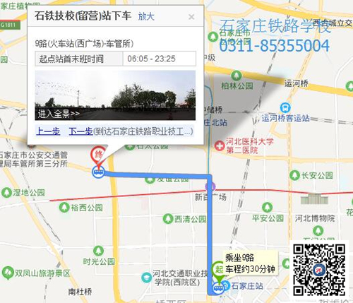 石家庄火车站西广场乘坐9路公交车到石铁技校(留营)站下车站牌对面就是学校门口,乘车时间约35分钟。